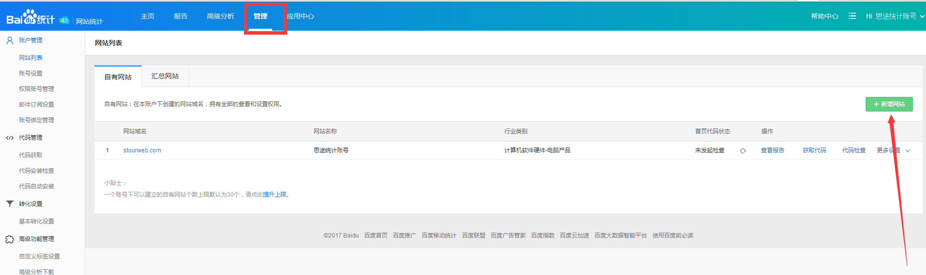 登陸注冊好的統(tǒng)計賬號,點擊管理-》添加網(wǎng)站