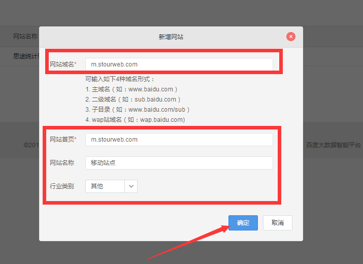 輸入移動站點域名,首頁,網(wǎng)站名稱,點擊確認。