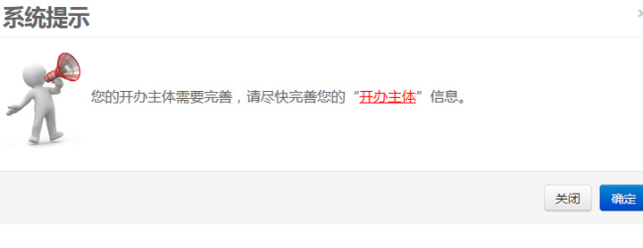 對首次登錄系統的用戶,系統會自動彈出提示信息,提示您先填寫開辦主體信息。