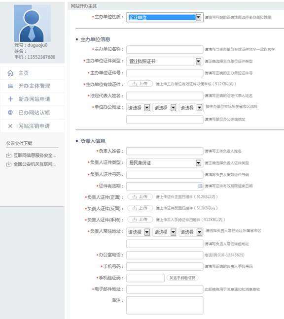 開辦主體申請: 對于首次備案的用戶,必須首先填寫主辦單位及負責人的真實有效信息,只有提交了主體信息后,才能在該主體下進行網站備案。