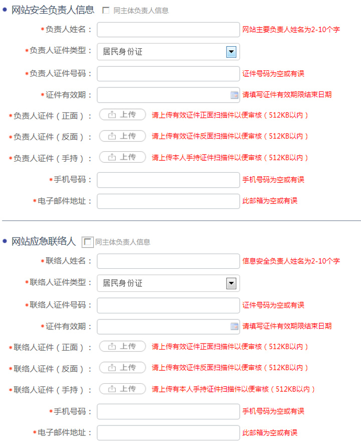 如果網站負責人信息/信息安全負責人信息/輿情引導員信息與開辦人主體負責人信息相同直接打鉤即可自動填充,如果不同則根據實際情況分別填寫。