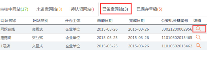 可分別根據網站名稱、網站域名、公安機關備案號來查詢是否已經存在備案信息,查到顯示如下頁面: