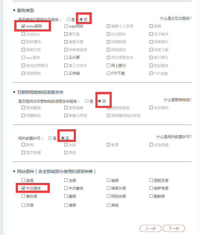④ 網站服務類型:單位可選擇單位門戶網站,個人可選擇博客/個人空間,如有其他類型內容可如實勾選。