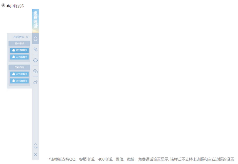 (6)客戶樣式6:支持QQ客服、客服電話、400電話、微信二維碼、官方微博、以及免費電話的顯示,點擊TOP可以 回到頂部