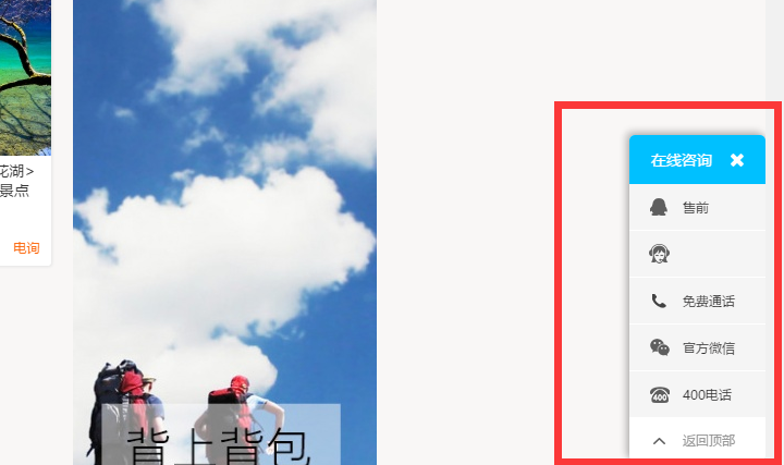 (5)客戶樣式5:支持QQ客服、客服電話、400電話、微信二維碼、官方微博、以及免費電話的顯示,點擊TOP可以 回到頂部