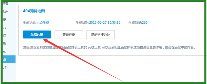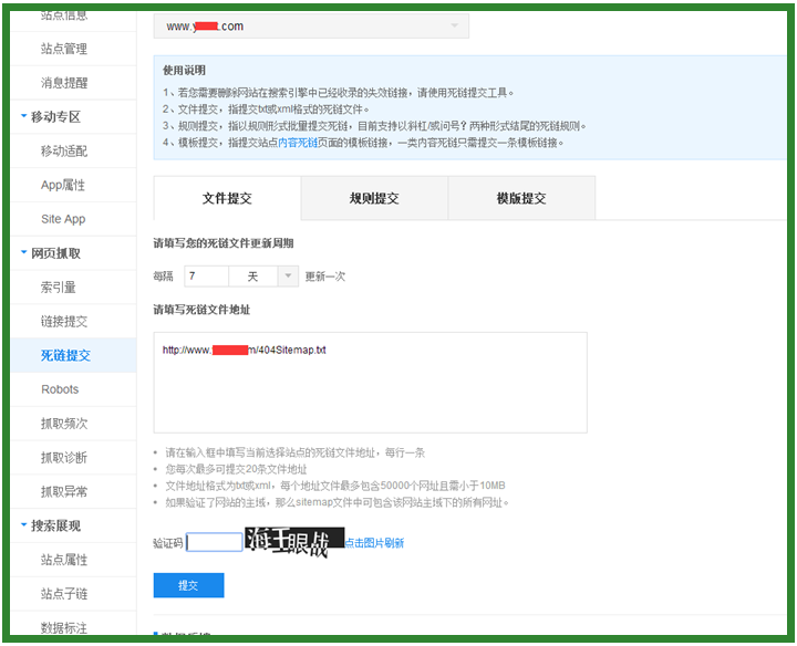 將瀏覽器地址:www.xxx.com/404Sitemap.txt 提交百度站長工具 其中XXX代表域名,點擊左側死鏈提交,填寫更新時間,以及死鏈文件地址即可!