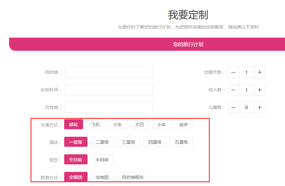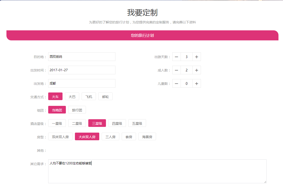 2、旅行計劃:包括目的地、出發地、出發日期、天數、人數和屬性