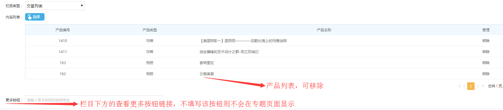 C、更多按鈕的鏈接設置:每個欄目下方會有查看更多的按鈕,設置了鏈接,則會在專題頁面顯示,沒有設置則不會顯示