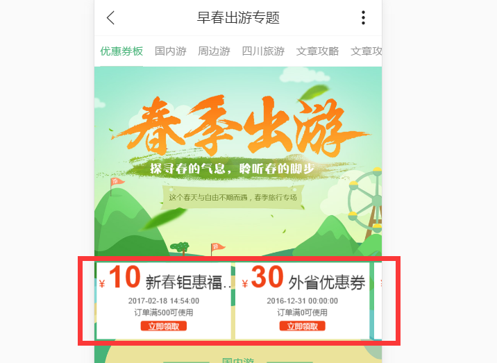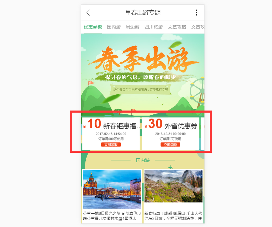 早春出游專題模板優(yōu)惠券模塊需要購買優(yōu)惠券應(yīng)用才會有優(yōu)惠券模塊展示(沒有購買不會展示)