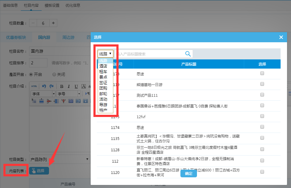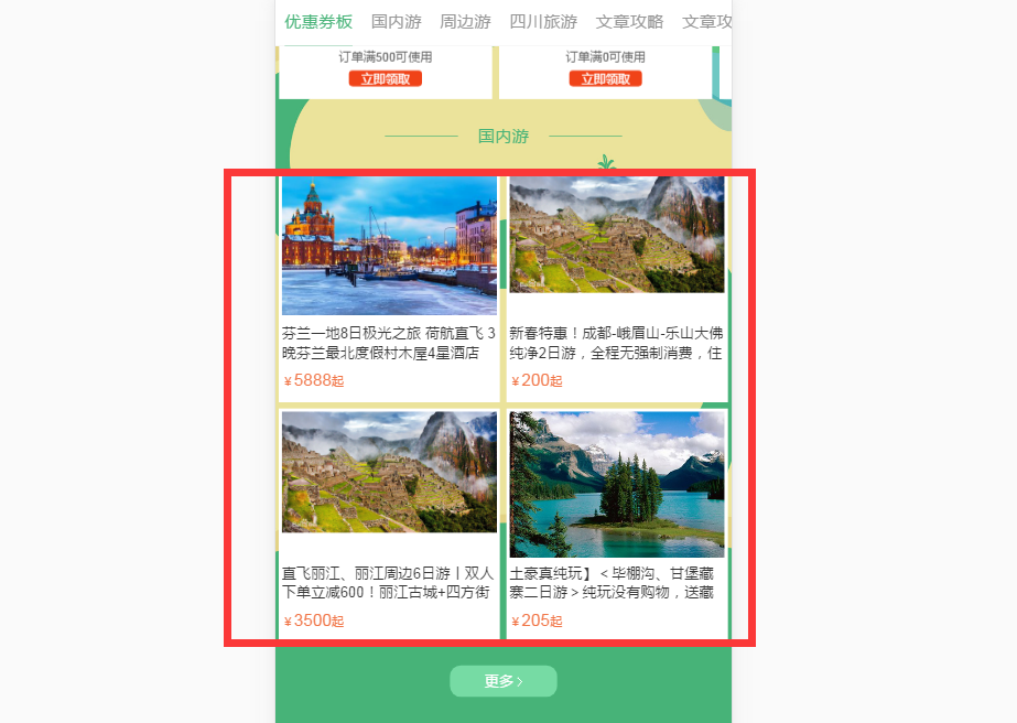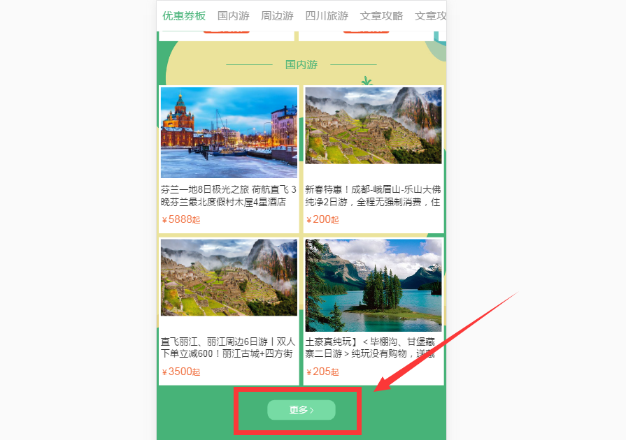 以上步驟操作完成后,專題頁(yè)面國(guó)內(nèi)游板塊就會(huì)展示勾選的這幾個(gè)線路產(chǎn)品