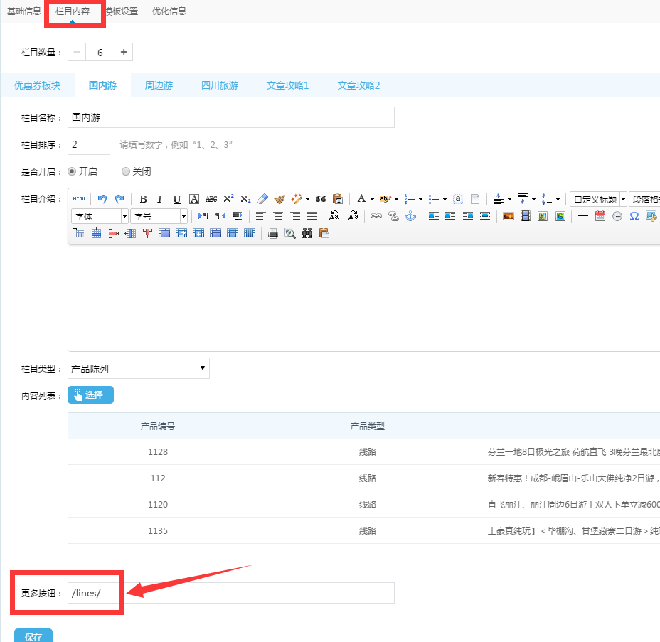 比如下方截圖中,在更多按鈕處填寫了/lines/ 這是線路欄目首頁(yè)的鏈接,客戶在專題頁(yè)國(guó)內(nèi)游模塊下就會(huì)對(duì)應(yīng)有一個(gè)更多的按鈕,點(diǎn)擊更多就可以跳轉(zhuǎn)到設(shè)置的/lines/頁(yè)面