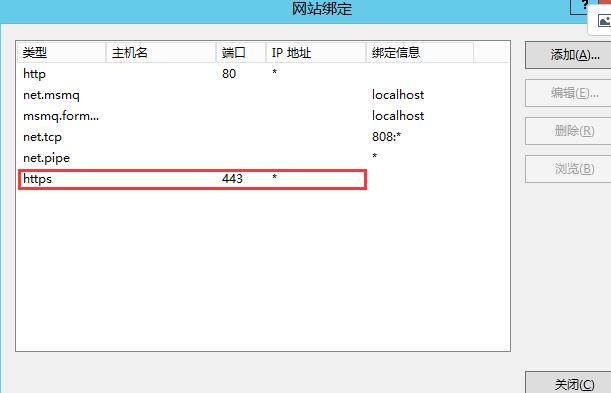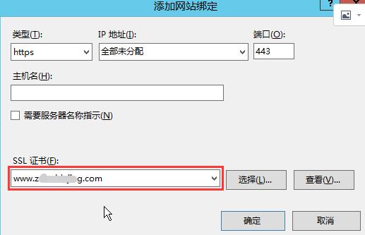 添加網站綁定內容:選擇類型為https,端口443和指定對應的SSL證書,點擊確定