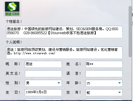 這是QQ最常見(jiàn)的基礎(chǔ)資料卡,旅游網(wǎng)站要盡可能完善自己的資料,建立給人信賴的印象,思途建議您的昵稱使用真名或者旅行社的名稱,頭像可以使用旅游網(wǎng)站的統(tǒng)一的logo,不要使用花哨的圖片和火星文當(dāng)做昵稱,會(huì)給人一種不成熟、非主流的印象。