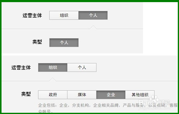 1、登記提交的資料不同。申請個人賬號,最重要的是提交手持個人身份證的照片。申請組織,提交企業營業執照、注冊號、運營者手持身份證掃描件等更多資料。