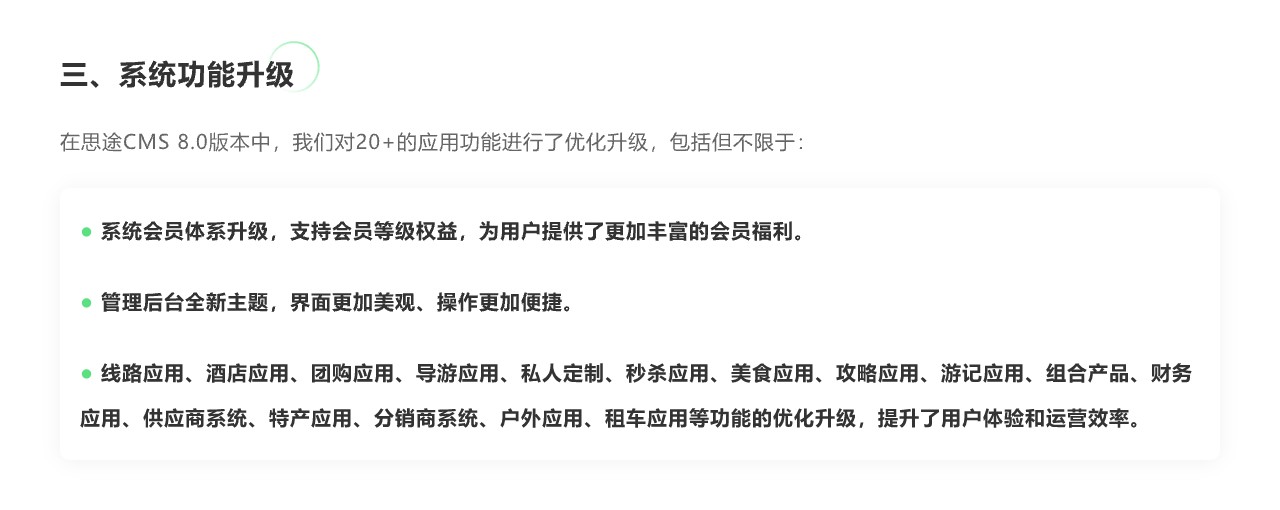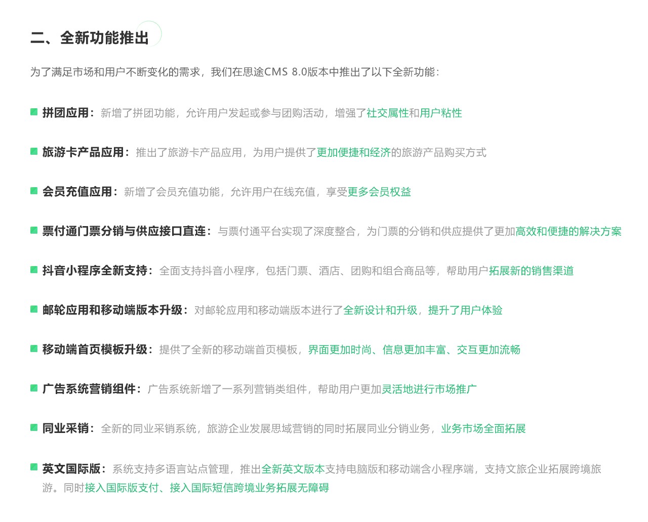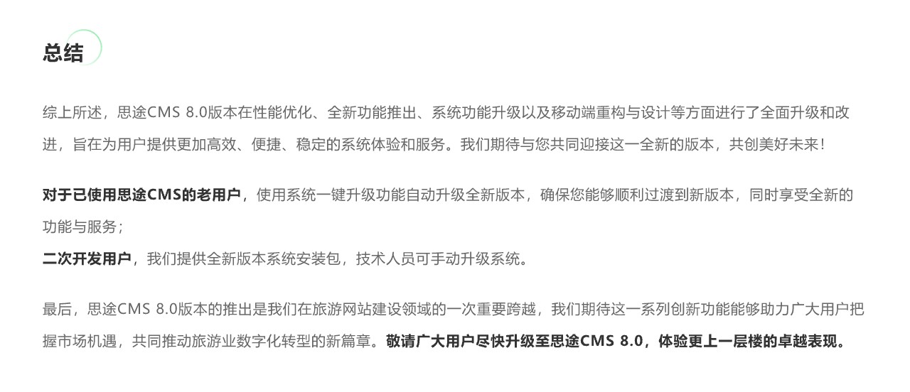 總結,思途CMS 8.0版本的推出是我們在旅游網站建設領域的一次重要跨越,我們期待這一系列創新功能能夠助力廣大用戶把握市場機遇,共同推動旅游業數字化轉型的新篇章。敬請廣大用戶盡快升級至思途CMS 8.0,體驗更上一層樓的卓越表現。