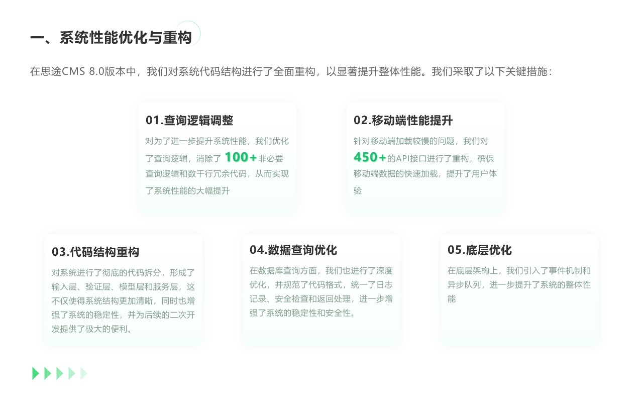 思途CMS 8.0版本在保證功能強大之余,也注重底層架構的優化,提升了系統運行速度和并發處理能力。