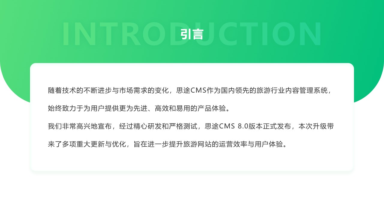 隨著技術的不斷進步與市場需求的變化,思途CMS作為國內領先的旅游行業內容管理系統,始終致力于為用戶提供更為先進、高效和易用的產品體驗。我們非常高興地宣布,經過精心研發和嚴格測試,思途CMS 8.0版本正式發布,本次升級帶來了多項重大更新與優化,旨在進一步提升旅游網站的運營效率與用戶體驗。
