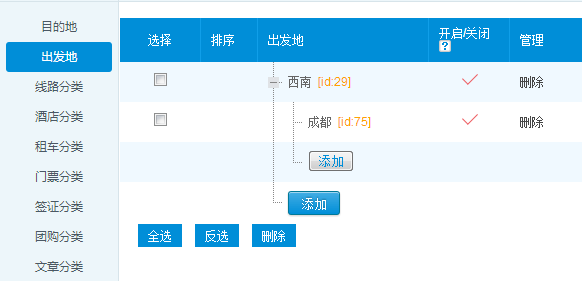 我們在添加內容的時候,需要選擇出發地,這里的第一級菜單(西南,歐洲出發地)并不會出現在出發地的選項中,因為他是分類名稱。而第二級菜單(成都,重慶,德國,法國)才是我們設置的出發地。