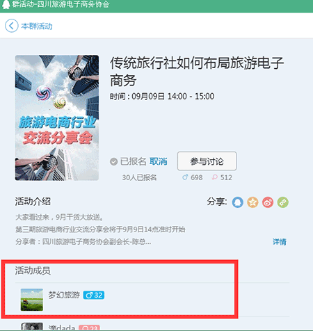 一般QQ群里面有一個叫QQ群活動的應用,當群主創(chuàng)建活動后,很多有意向的人會報名參加活動,比如是一個旅行社的群,里面有很多游客,當大家看到創(chuàng)建的活動后,點擊報名,點擊報名后,所以這部分人是有意向的,在活動結(jié)束之前,你可以采用技術的方式,將這部分人的QQ號碼獲取下來,然后針對性的去銷售,相信是有一定作用的!