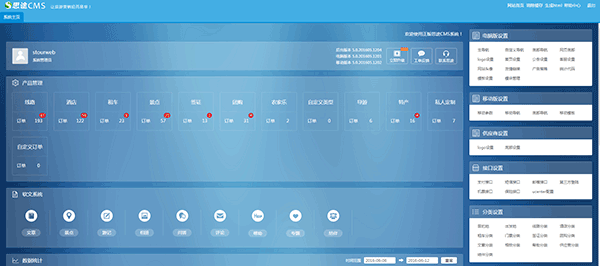 思途旅游管理系統中,功能拆分為十二大板塊,其中有產品、軟文營銷、訂單管理、基礎設置(包括首頁的主導航、底部導航)、分類、模板、營銷、系統、會員、應用、助手,每一個大板塊中包含很多的小分類,可以到思途CMS介紹頁面進行詳細了解。如圖四、五: