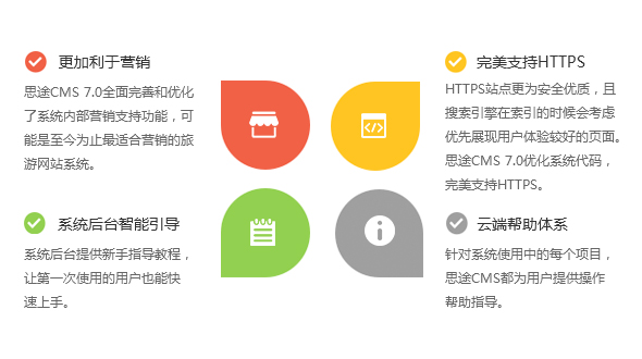 HTTPS站點更為安全優質,且搜索引擎在索引的時候會考慮優先展現用戶體驗較好的頁面。思途CMS 7.0優化系統代碼,完美支持HTTPS。