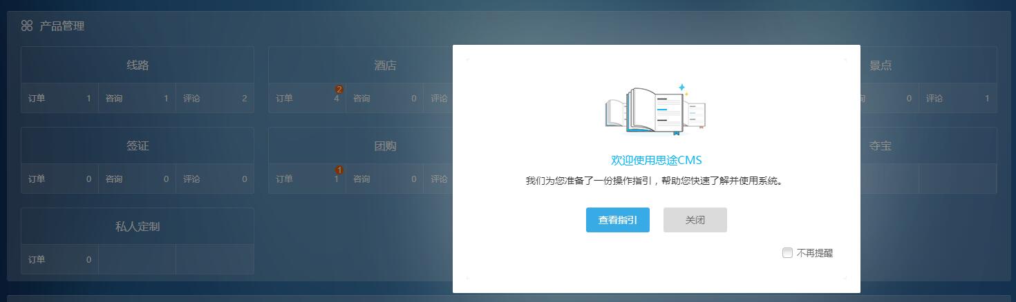 思途CMS為新用戶準備了一份操作指引,幫助用戶快速了解和使用系統。新用戶在首次使用系統時,將會出現指引界面,引導用戶完成網站和產品配置。