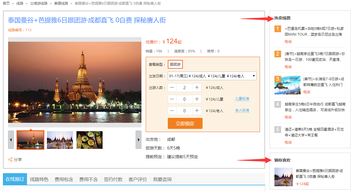 這是一個(gè)對旅行社來說更加實(shí)用的場景。舉個(gè)栗子,你可以在線路欄目內(nèi)添加一個(gè)目的地相關(guān)的酒店、景點(diǎn)、文章模塊。這樣,用戶在瀏覽三亞線路產(chǎn)品時(shí),右側(cè)就會向用戶推薦三亞附近的酒店、好玩的地方或者三亞的旅游攻略;用戶瀏覽成都的線路,系統(tǒng)就會向用戶推薦成都的酒店、景點(diǎn)。用戶很有可能在預(yù)訂了線路產(chǎn)品的時(shí)候又順便定了個(gè)推薦的酒店。