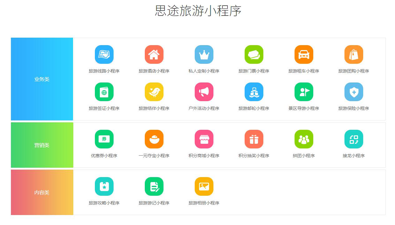 大家都知道,早在小程序剛推出之際,思途為了幫助大家搶占這波流量紅利,率先研發(fā)了多種小程序產(chǎn)品,全面覆蓋了業(yè)務開展、營銷推廣、內容分享這三大類旅行社主要業(yè)務。同時,思途本著不斷優(yōu)化、精益求精的精神,對小程序也持續(xù)著改進與完善的工作。