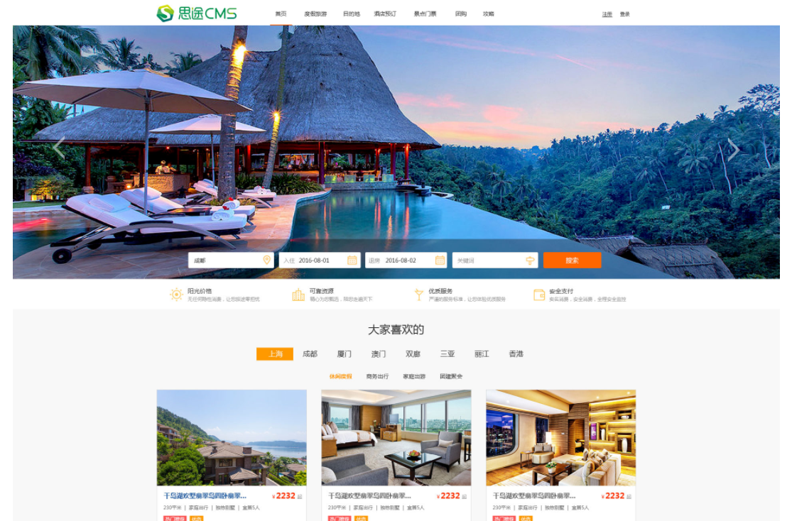 還有一些朋友的網(wǎng)站可能是專注于某一類型的產(chǎn)品,比如是專做酒店產(chǎn)品的電商平臺,那這個時候,我們可能就會考慮網(wǎng)站的專業(yè)性。在沒有額外預(yù)算做定制開發(fā)的情況下,我們就可以考慮精準(zhǔn)的類型模板。以酒店網(wǎng)站為例,我們的站長朋友就可以選擇思途仿途家酒店首頁模板。這套模板就是專為酒店平臺量身打造,一切導(dǎo)向都以酒店業(yè)務(wù)為基準(zhǔn)。游客進(jìn)入我們的網(wǎng)站后,就可以快速地篩選查找和預(yù)訂酒店產(chǎn)品了。 此外,本套模板也配備了攻略和游記等引導(dǎo)模塊,也利于站長在網(wǎng)站進(jìn)行軟文推廣哦。