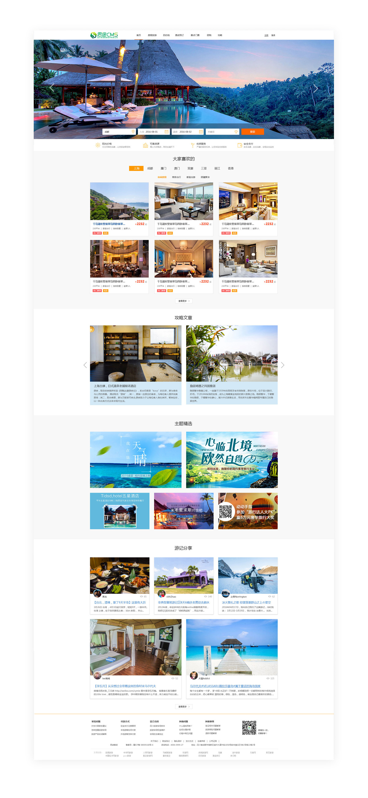 (網站首頁)此套仿途家酒店首頁模板,適合以旅游酒店預訂為主要業務的網站使用。模板分類清晰,支持首頁輸入入住城市,入住時間進行快速篩選。還可設置入住類型,提供編輯精選推薦,方便游客選擇預訂。配合首頁攻略文章和游記分享選項,網站內容豐富,利于在網站進行軟文推廣。此套仿途家酒店首頁模板,是適合旅游酒店預訂網站的優秀模板。*該模板不支持換膚。